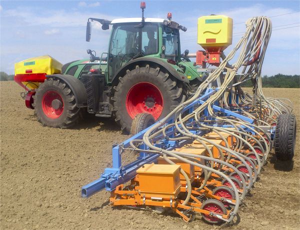 Für hohe Erträge muss Soja bei der Saat mit Knöllchenbakterien geimpft werden. Technik-Plus hat nun eine Dosiereinrichtung für eine 12 m (24 Reihen) breite Einzelkornsämaschine vorgestellt, die neben dem Impfgranulat auch spezielle Saatbanddüngers ausbringen kann. Dabei werden Flächenleistungen bis zu 5 ha in der Stunde erreicht. Das Impfgranulat wird über den „Turbo-Jet-Super“ mit elektrischem Gebläse (2x Hochleistungs-Doppelturbine) direkt in die Saatrille platziert, während der Saatbanddünger über den Front-Turbo direkt vor den Zustreichern abgelegt wird. Die Mengenregulierung beider Produkte wird mit einer vollautomatischen Kontrollbox geregelt (Twin-Steuerung). Der Saatbanddünger sichert ein zügiges Jugendwachstum und verbessert damit Qualität und Ertrag.