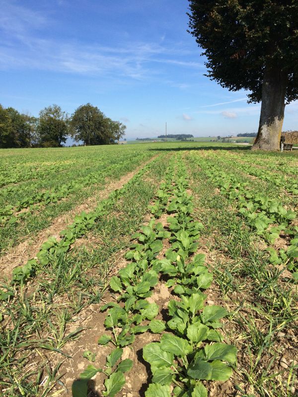 Seit über 25 Jahren wird das in der Schweiz entwickelte pfluglose Rotor Strip Till Verfahren erfolgreich angewendet. In einem Arbeitsgang düngen, tiefenlockern, fräsen und säen, das spart Zeit, Geld und hält die Bodenstruktur intakt. Die unbearbeiteten Streifen schützen vor Erosion und speichern Wasser. Obwohl die Streifenfräse bisher hauptsächlich für die Saatbettbereitung zu Mais eingesetzt wird, kann das Rotor Strip Till Verfahren auch erfolgreich bei anderen Reihenkulturen wie Winterraps angewendet werden. Dies zeigte ein erfolgreicher Praxisversuch in der Schweiz auf 650 m Höhe. Im September 2015 wurde der Raps mit der Streifenfräse Oekosem von Baertschi direkt in eine Wiese gesät. Der Raps war viel robuster und vitaler als die konventionell bearbeitete Variante und hatte schließlich auch eine größere Blütenkrone.