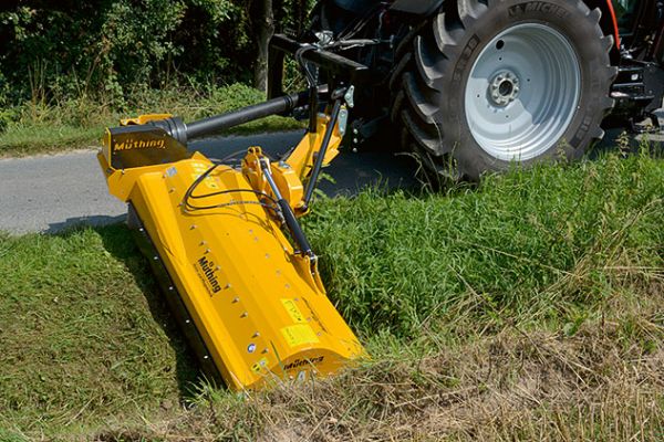 Die ersten Kunden haben die 2016 vorgestellten Mulchgeräte-Baureihen MU-E Vario und MU-H/S Vario von Müthing erfolgreich eingesetzt. Wenn eine intensiveren Zerkleinerung gewünscht wird, kann hier der Schneidspalt zwischen Vario-Schneidschiene und Hammerschlegel verringert werden. Damit lässt sich die Verrottung des Mulchgutes beschleunigen. Auf extensiven Flächen kann dagegen energieeffizient mit großem Schneidspalt gearbeitet werden. Das MU-E Vario Mulchgerät ist in den Arbeitsbreiten von 1,2 bis 2,0 m für Traktoren von 25 bis 60 PS verfügbar. Das Seitenmulchgerät MU- H/S Vario ist ebenfalls mit dem MU-Vario System ausgestattet und für Antriebsleistungen von bis zu 90 PS ausgelegt. Der MU-H/S Vario (Bild) bietet 1,55 m Verschiebebebereich, der Schwenkbereich reicht von 90° nach oben bis zu 60° nach unten. Damit können mit einer Arbeitsbreite von bis zu 2,0 m auch tiefe Gräben sauber gemulcht werden.
