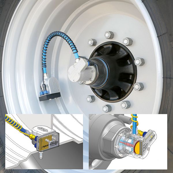 Die PTG Reifendruckregelsysteme GmbH stellt eine Hybridtechnologie für Reifendruckregelanlagen vor. Dahinter verbirgt sich eine kontaktlose Daten- und Stromübertragung, die in der Drehdurchführung integriert ist. Sie ermöglicht das ständige Messen und Überwachen des aktuellen Reifendrucks, ohne dass das schaltbare Hybrid-Radventil in der Felge geöffnet werden muss. Dies geschieht durch einen in das Hybrid-Radventil integrierten Drucksensor, der eine hochpräzise Messung und Verstellung des Reifendrucks jedes einzelnen Reifens separat ermöglicht. Mit der kontaktlosen Strom- und Datenübertragung wird zudem eine Schnittstelle geschaffen, mit der weitere radseitige Sensorik integriert werden kann, z. B. Lastaufnahme oder Reifenerkennung. Dies soll in Zukunft eine vollautomatisierte Reifendruckregelung ermöglichen.