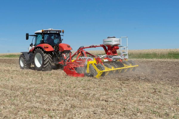 Das System der Multiline von Pöttinger kombiniert ein Bodenbearbeitungsgerät mit einer Sämaschine. So entsteht eine kostengünstige und sehr flexible Mulchsaat-Technik, die auch von leichten Traktoren gezogen werden kann. Erstmals ist Multiline nun auch in Verbindung mit dem Zwischenfruchtsäaggregat Tegosem verfügbar, in Arbeitsbreiten von 3 und 4 m. Das Basisgerät bildet die Kurzscheibenegge Terradisc oder der Grubber Synkro, jeweils in Kombination mit dem neuen Reifenpacker. Die Maschine wird gezogen und über eine Deichsel an den Unterlenkern Kat. II/ Weite 2 angehängt. Die Saatgutverteilung erfolgt pneumatisch über Verteilbleche. Die Tegosem verfügt serienmäßig über ein einfaches Bedienterminal, über welches die Ausbringmenge elektronisch eingestellt werden kann. Das Sägerät zeichnet sich durch einen Füllstandsensor, einen DGPS-Sensor für das Geschwindigkeitssignal, Sensoren am Oberlenker bzw. Fahrwerk für den Dosierstart bzw. -stopp sowie eine Aufstiegsplattform aus. Technische Voraussetzung ist eine dreipolige Steckdose am Schlepper.
