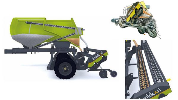 Für Sämaschinen mit größeren Arbeitsbreiten haben sich pneumatische Verteiler durchgesetzt, die jedoch einige Nachteile haben wie mögliche Saatgutbeschädigungen, Geräuschentwicklung oder die Freisetzung von giftigen Beizstäuben. Mit der Universalsämaschine Junkarri W700 wird zur Agritechnica eine interessante Alternative vorgestellt: Die Förderung von Saatgut und Dünger aus einem zentralem Tank auf 7 m Arbeitsbreite wird hier von neu entwickelten Doppel-Schneckenförderern übernommen. Diese Schneckenausleger lassen sich einfach auf 3 m Transportbreite einklappen. Die Saatgutdosierung erfolgt dabei über das bewährte mechanische Dosiersystem der Junkarri SMD-Serie. Die Doppelscheibenschare haben einen Abstand von 15,9 cm und der Schardruck beträgt 20-100 kg. Der große 6500 Liter Kombitank hat eine feste Trennwand, mit der die Verteilung des Düngers und des Saatguts im Verhältnis 60 zu 40 erfolgt.