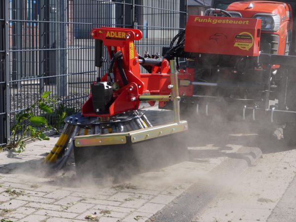 Zu Bekämpfung von Wildkräutern auf gepflasterten Flächen bietet Adler Arbeitsmaschinen eine neue Wildkrautbürste an, die sich an alle gängigen Traktoren, Hoflader und Kommunalfahrzeuge anbauen lässt. Zu den zahlreiche Funktionen gehört die mechanisch oder hydraulisch gesteuerte Längs- und Querneigung. Das Trägerfahrzeug benötigt lediglich einen doppeltwirkenden Steuerkreis, auf Wunsch ist auch eine Funkfernbedienung lieferbar. Um für jeden Belag die passende Bürste zu haben, sind zudem unterschiedliche Bürstenaufsätze erhältlich. Die neue Wildkrautbürste ergänzt die handgeführten Kehrmaschinen und Infrarotgeräte von Adler, die ebenfalls eine herbizidfreie Unkrautbekämpfung ermöglichen.