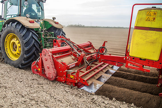 Mit 4-reihige Fräse GF 400 bietet Grimme eine vielseitig einsetzbare Dammfräse an. Durch den verstärkten Anbaurahmen mit Dreipunktbock und Anhängung für eine gezogene Legemaschine sowie die robusten Stützräder ist ein kombinierter Einsatz mit Legemaschinen möglich. Das reduziert die Arbeitszeit und schont den Boden durch weniger Überfahrten und Arbeitsschritte. Dabei lassen sich die Fräse oder die Legemaschine auch einzeln nutzen. Die Dammfräse ist mit 75 oder 90 cm Reihenweite einsetzbar. Die robuste Anhängung für die Legemaschine sorgt für eine hohe Wendigkeit am Vorgewende. Durch die Straßenzulassung (75 cm Reihenweite) für Deutschland ist ein aufwendiges An- und Abkoppeln der Legemaschine für den Straßentransport nicht mehr notwendig. Die Dammfräse GF 400 ist optional auch mit einem Hochleistungsgetriebe für Traktoren bis zu 500 PS lieferbar.