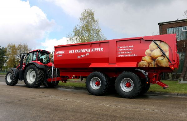 Der neue Wannenkipper Big Body 740 von Krampe ist eine Kombination aus einem Big Body 700-Fahrgestell und einem Big Body 750-Aufbau. Die verlängerte Wanne erzeugt ein vergrößertes Transportvolumen von bis zu 39,1 m3 mit Silageaufsatz, ohne dass dabei größere Fallhöhen entstehen. Für einen besseren Blick auf das Ladegut lassen sich bei dem Kipper wahlweise zusätzliche Fenster einbauen. Am Heck können zum Standard-Auslaufschieber zwei weitere rechts und links ergänzt werden, um eine noch bessere Dosierung beim Abladen zu erreichen. Optionale Fallsegel oder Fallbrecher lassen die Kartoffeln beim Beladen schonend zu Boden gleiten, wodurch Beschädigungen vorgebeugt werden sollen.