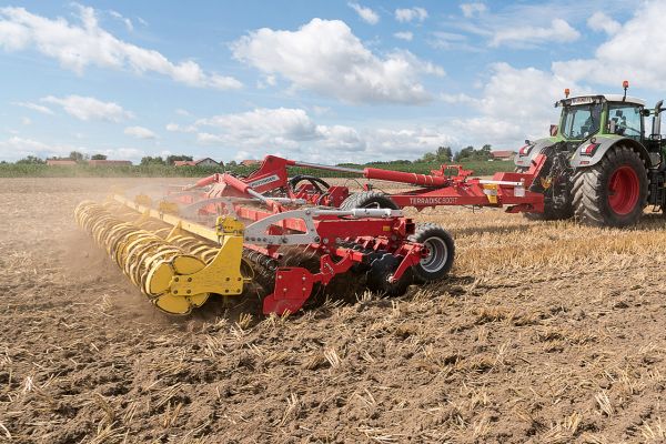 Die neue Pöttinger Terradisc 8001 T und 10001 T sind in 8 bzw. 10 m Arbeitsbreite erhältlich. Besonderheit ist die Aufhängung der Scheiben mit dem Twin Arm-System: Zwei massive, geschmiedete Tragarme sind jeweils auf einer sehr breiten Klemmschale verschweißt. Das bewirkt, dass die Scheiben immer die Position und Einstellung beibehalten. Somit können auch harte Fahrspuren aufgebrochen werden. Außerdem wurde das Verhältnis von Form, Größe, Anstellwinkel und Untergriff der Scheiben optimiert, um die Mischwirkung weiter zu verbessern. Die Terradisc ermöglicht Arbeitstiefen von 5 bis 15 cm und eine Arbeitsgeschwindigkeit bis zu 18 km/h. Durch die gedämpfte Nachlaufwalze wird das Gewicht auf die gesamte Arbeitsbreite verteilt, außerdem passen sich auch die einzelnen Klappfelder individuell den Bodenkonturen an. Als Nachläufer werden folgende Walzen angeboten: Rohrstabwalze, Schneidpackerwalze, Gummipackerwalze und Tandem Conoroll. Optional ist eine Steuerung über ISOBUS und Load Sensing Hydraulik erhältlich.