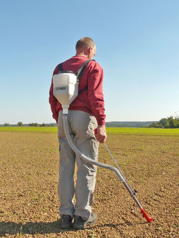 Rodentizide zur Bekämpfung von Feldmäusen müssen verdeckt ausgebracht werden. So soll verhindert werden, dass andere Wildtiere die Köder aufnehmen und sich damit vergiften. Für die verdeckte Ausbringung in die Mäuselöcher wird eine Legeflinte benötigt. Die Lehner Agrar GmbH hat für diese Aufgabe eine neue Rucksack-Legeflinte entwickelt, die leer nur 1,5 kg wiegt und mit bis zu 5 kg Giftweizen befüllt werden kann. So sind mit nur einer Füllung große Flächenleistungen erreichbar. Die Ausbringmenge pro Klick ist verstellbar. Zur Verbesserung der Ergonomie sind nicht nur Handgriff und Schlauch, sondern auch Tragegurt und Schlauch einstellbar.