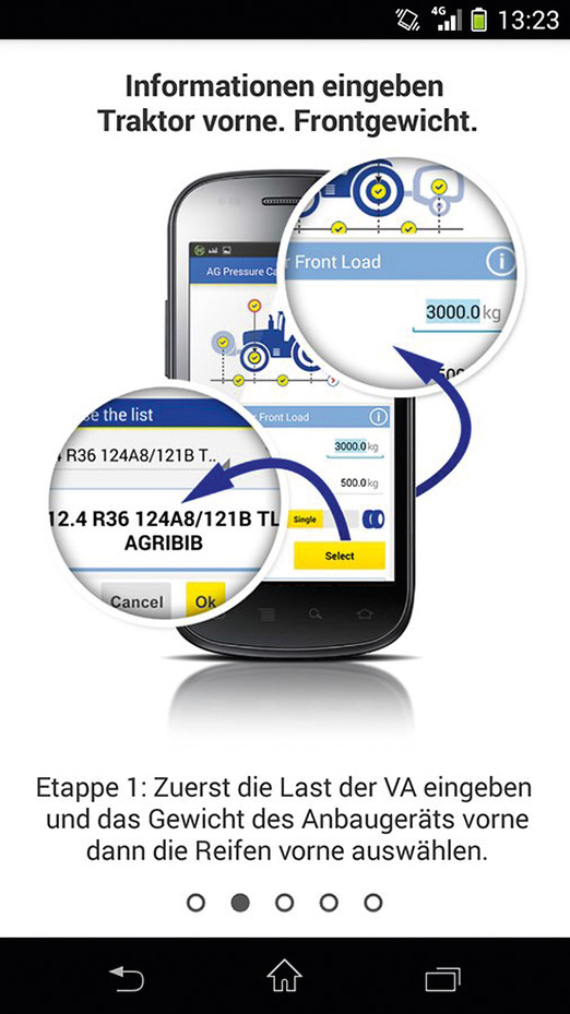 Michelin ermöglicht mit einer kostenlosen Smartphone-App die Berechnung des korrekten Reifenfülldrucks bei Traktoren. Nutzer der App müssen die maximale Achslast vorne und hinten eingeben. Anschließend ist mithilfe eines Drop-Down-Menüs der Reifentyp auszuwählen und mit dem Smartphone ein Foto des Traktors aufzunehmen. Das in die App integrierte Kameramodul vereinfacht die für die Berechnung der Lastverschiebungen notwendigen Dateneingaben. Die Bildverarbeitungssoftware der App misst anhand der Aufnahme den Abstand zwischen den Achsen und dem hinten oder vorne montierten Anbaugerät. Auf Basis dieser Werte ermittelt sie präzise die Gewichtsverteilung auf die Achsen. Diese Funktion ist einmalig auf dem Markt. Aus den Angaben errechnet die App blitzschnell den optimalen Luftdruck für die Reifen, je nach gewünschter Beladung und Geschwindigkeit. Der „Michelin Luftdruckkalkulator“ lässt sich für Android und iOS Smartphones herunterladen.