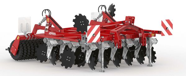 Die Kurzscheibeneggen von Evers wurden überarbeitet. Neu sind die Steinsicherung mit Gummielementen und die wartungsfreie Lagerung. Neben der zweireihigen Standardausführung ist bereits seit längerem eine vierreihige Kurzscheibenegge erhältlich, die sich durch eine besonders intensive Schnitt- und Mischwirkung auszeichnet. Damit eignet sich diese Ausführung z. B. zum Umbruch von Kleegras; Unkräuter und Ungräser werden ganzflächig abgeschnitten. Durch den größeren Scheibenabstand der vierreihigen Scheibenegge arbeitet diese auch bei vielen Ernterückständen verstopfungsfrei. Die Scheibenegge wird zunächst mit 3,0 m Arbeitsbreite angeboten, optional erhältlich sind eine hydraulische Walzenverstellung, verschiedene Nachlaufwalzen, Seitenschilder sowie eine pneumatische Sämaschine.