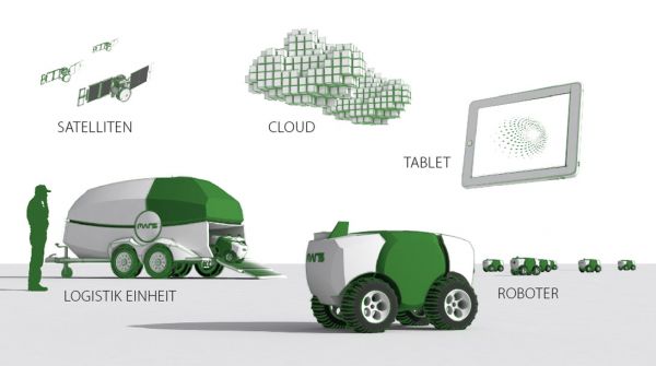 Dahinter steckt die Vision, dass in Zukunft Schwärme kleiner, mobiler Feldroboter viele Feldarbeiten erledigen sollen, z. B. bei der Aussaat und Pflege eines Maisfeldes. Jeder Roboter verfügt über eine eigene Säeinheit und wird elektrisch angetrieben. Die satellitengestützte Navigation ermöglicht eine autonome Operation sowie exakte Dokumentation bzw. Auswertung aller Saatdaten. Autonom, präzise und Cloud-gesteuert sollen die Feldroboter ihre Arbeit erledigen, wie z. B. Saatgut auslegen, Unkraut zupfen, Pflanzen bonitieren, Pflanzenschutzmittel und Dünger ausbringen. Zwischendurch fahren die einzelnen Roboter immer wieder automatisch gesteuert zur Logistik-Einheit, bunkern Saatgut oder Dünger und laden ihren Akku wieder auf, selbstverständlich mit regenerativ erzeugtem Strom. Danach setzen sie ihre Arbeit wieder fort - 24 Stunden am Tag, 7 Tage in der Woche.