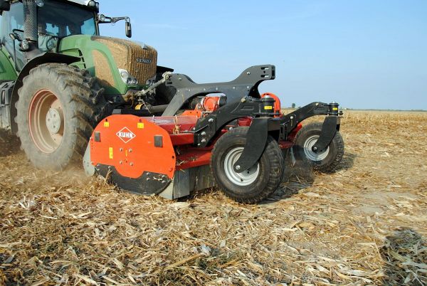 Kuhn erweitert sein Programm an Universal-Mulchgeräten um die neue Serie BCR 1000, die sowohl vorne als auch hinten angebaut werden können. Aufgrund des soliden Aufbaus der beiden Modelle BCR 2800 und BCR 3200 (2,80 bzw. 3,23 m Arbeitsbreite) sind hohe Fahrgeschwindigkeiten auch bei vielen Pflanzenrückständen möglich. Die Mulchgeräte verfügen über eine Stützwalze oder schwenkbare Räder für eine gute Bodenanpassung, einen großen Rotor (647 mm) sowie eine schraubenförmige Anordnung der Hammerschlägel. Optional erhältliche Y-Universalmesser mit Gebläseschaufeln saugen die auf dem Boden lagernden Pflanzenrückstände an und zerkleinern diese gleichmäßig.