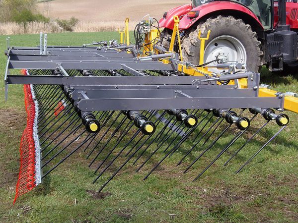 Der hydraulische Strohstriegel „Straw-Master“ von der Firma Wallner kann zur Optimierung der Strohverteilung, aber auch zur leichten Bodenbearbeitung auf dem Acker verwendet werden. Der Schwerstriegel mit 16 mm starken Zinken ist damit zur flachen Einarbeitung von Gülle und Stallmist sowie zur Saatbettbereitung bei Mulchsaat geeignet. Um diesen Strohstriegel noch vielseitiger nutzen zu können, bietet Wallner jetzt mit der Planierschiene und der Federzinkenleiste neue Zusatzausrüstungen an. Diese Werkzeuge werden unten an die Zinkenreihen angeschraubt. So lässt sich der Straw-Master jetzt auch zur schonenden Pflege von Grünland sowie zur mechanischen Pflege von Getreidebeständen einsetzen. Die Aggressivität dieser Werkzeuge ist am Striegelzinken einstellbar. Lieferbar ist außerdem eine Messerwalze, die sich vor dem Zinkenfeld montieren lässt.