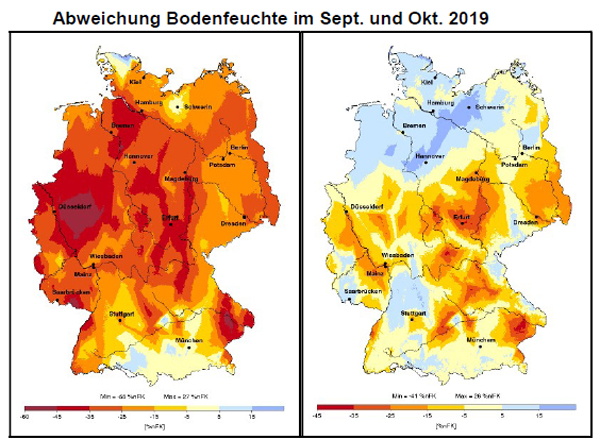 - Bild 2: Abweichung der Bodenfeuchte zum vieljährigen Mittel in % nFK im September (linnks) und Oktober 2019 (rechts)