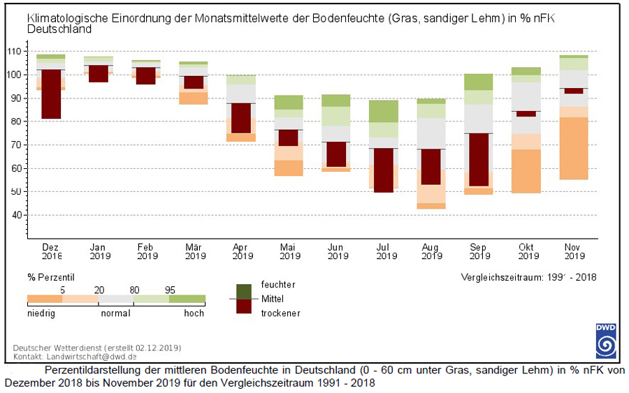Nach Angaben des Deutschen Wetterdienstes brachte der vergangene Herbst den Böden das langersehnte Nass und konnte vielerorts die angespannte Bodenfeuchtesituation mildern. Die tiefen Bodenschichten aber blieben oft weiterhin zu trocken, was noch aus dem Wasserdefizit des Vorjahres resultierte. Vor allem die Wälder litten laut DWD darunter. Die vergleichsweise hohen Temperaturen ließen die Pflanzenwelt bis Ende November noch nicht so recht zur Ruhe kommen.