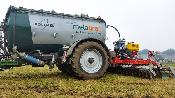 Mit dem MelaGran Dünger bietet Bollmer einen organischen Volldünger an, der bei der Fermentation von Zuckerrübendicksaft im Rahmen einer Vitamin-Synthese entsteht. Der preiswerte organische NPK-Dünger enthält 3,0 % N, 1,5 % P2O5 und 2,0 % K2O. Ausgebracht wird das Produkt mit einem Spezialdüngefass mit bodenschonender Bereifung. Besondere Pumpen und Düsen erlauben, Mengen zwischen 2 bis 6 t/ha streifenförmig mit 35 Zentimeter Abstand exakt auf zehn Zentimeter Tiefe einzuarbeiten. Durch eine nachlaufende Scheibenegge erfolgt eine verlustfreie Einarbeitung. Auf Wunsch kann im Sommer auch die Zwischenfruchtaussaat mit einem pneumatischen Sägerät erfolgen. MelaGran steht ab sofort für die Anbauregionen in Baden-Württemberg, Bayern und Hessen zur Verfügung.