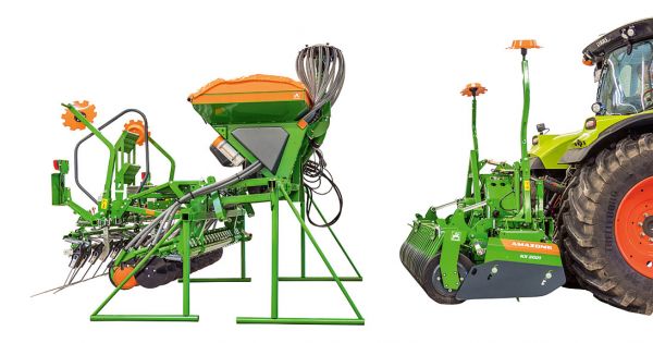 Für die Kombination mit der Kreiselegge KE 01 und den Kreiselgrubbern KG / KX 01 bietet Amazone jetzt die pneumatische Aufbausämaschine AD-P 01 Special mit 3 m Arbeitsbreite an. Dank der Schnittstelle QuickLink lässt sich das Bodenbearbeitungsgerät innerhalb weniger Minuten von der Aufbausämaschine trennen, um es im Soloeinsatz zu nutzen. Gewählt werden kann zwischen einem 850 l oder einem 1.250 l fassenden Saatgutbehälter. Als Scharsysteme stehen u. a. auch die RoTeC-Control-Schare mit Reihenabständen von 12,5 cm oder 15 cm zur Verfügung. Die Steuerung der Maschine kann wahlweise über den Bediencomputer AMADRILL+ oder ein ISOBUS-Terminal erfolgen. Die Fahrgassenschaltung erfolgt direkt am Segmentverteilerkopf und ist sehr flexibel an die Spurbreite und Reifenbreite anzupassen. Für die Rückverfestigung des Bodens kann die AD-P 01 Special wahlweise mit der Zahnpackerwalze PW 600, der Keilringwalze KW 580, der Keilringwalze mit Matrixreifenprofil KWM 600 sowie den Trapezringwalzen TRW 500 und TRW 600 ausgerüstet werden.