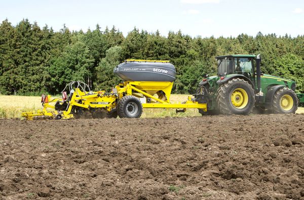 Bei der Unterflurdüngung wird der Dünger in tiefere Bodenschichten wie die Unterkrume oder die Krumenbasis abgelegt. Mit dieser platzierten Düngung soll vor allem das Wurzelwachstum in die Tiefe angeregt werden, wodurch den Pflanzen mehr Wasser zur Verfügung steht. Mit dem Ferti-Cart FC 3500 von Bednar wird ein gezogener Düngertank vorgestellt, der speziell für die platzierte Düngung entwickelt worden ist. Der Überdruck-Vorratsbehälter aus Kunststoff fasst 3.500 l und ermöglicht dank seiner Formgebung mit ausreichend Gefälle auch das Dosieren von schlecht fließenden Düngerarten. Der Ferti-Cart FC 3500 wird zusammen mit Bodenbearbeitungsgeräten eingesetzt, wie dem Tiefenlockerer Terraland, Terrastrip oder dem Grubber Fenix.