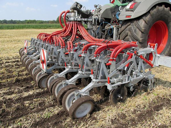 Vogelsang hat mit dem XTill 2011 das erste Gerät auf den deutschen Markt gebracht, das die Strip Till-Technologie mit der Gülleunterfußdüngung kombinierte. Beim neuen XTill VarioCrop (Bild S. 2/3) ist jetzt der Reihenabstand flexibel von 45 bis 75 cm einstellbar, womit sich eine Vielzahl von Kulturen wie Mais, Zuckerrüben, Raps, Sonnenblumen oder Körnerleguminosen im Strip Till-Verfahren anbauen lassen. Der XTill VarioCrop erzeugt sehr genaue und vom Zwischenbereich abgegrenzte Bearbeitungsstreifen. Die einstellbare Breite des sauber geräumten Streifens beträgt bis zu 25 cm. Für ideale Wachstumsbedingungen der Pflanzen ist eine unabhängige Tiefeneinstellung des Schares und der Gülleablage erforderlich, was durch eine neue Konstruktionslösung ermöglicht wird. So kann beispielsweise bei einer tiefen Lockerung eine flache Gülleablage erfolgen. Zudem kann die Gülle gleichzeitig unabhängig voneinander in zwei verschiedenen Tiefen abgelegt werden.