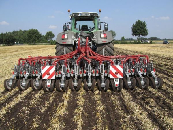 Das neue Strip Till-Gerät XTill VarioCrop von Vogelsang ermöglicht die streifenförmige Bearbeitung des Bodens mit gleichzeitiger Gülleunterfußdüngung für verschiedene Reihenkulturen. Dabei lassen sich Gülleablage- und Bearbeitungstiefe unabhängig voneinander einstellen. Erstmals lässt sich auch die Reihenweite der Aggregate von 75 cm bis 45 cm flexibel einstellen. Damit kann Strip-Till jetzt nicht nur zu Mais, sondern auch zu Raps, Sonnenblumen, Zuckerrüben- und weiteren Kulturen als boden- und umweltschonendes Anbauverfahren angewendet werden. Da die Gülle direkt im späteren Wurzelbereich der angebauten Pflanzen unterfuß abgelegt wird, treten keine umweltschädlichen Emissionen auf. Darüber hinaus erfüllt der Nutzer auch Vier-Stunden-Regel für die Gülleeinarbeitung.