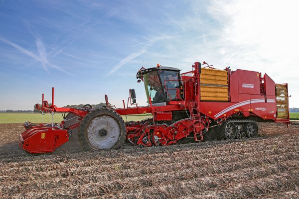 Die zweite Generation des 435 PS starken Varitron 470 Platinum von Grimme ist mit Raupenlaufwerken und serienmäßigem 7 Tonnen Bunker ausgerüstet. Das neue Bedienkonzept ErgoDrive erleichtert die intuitive Steuerung und den schnellen Direktzugriff auf alle Funktionen. Der zweite Schwerpunkt sind Verbesserungen bei der Rodetechnik, wie Optimierungen bei den Aufhängungen, der Umlenkungen der Siebbänder und der Zupfwalze beim Rollenseparator. Die stärksten TerraTrac-Raupenlaufwerke sorgen für die größtmögliche Bodenschonung und Stabilität am Hang. Die teleskopierbare Vorderachse ermöglicht den Einsatz eines breiten bodenschonenden Reifens. Der Selbstfahrer erfüllt die aktuelle Abgasstufe IV (Tier 4 Final) und ist sowohl als 75 cm wie auch als 90 cm Variante erhältlich.