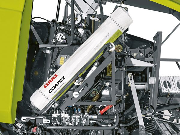 Mit Einführung der neuen Netz- und Folienbindung in der Rollant 400 Uniwrap Familie bietet Claas auch die dazugehörige Mantelfolie Coatex an. Hat ein Ballen in der Presskammer die gewünschte Größe erreicht, wird er automatisch mit bis zu acht Folienlagen Coatex gebunden. Anders als beim Netz ragen die Folienlagen einige Zentimeter über die seitlichen Ballenränder hinaus. Beim anschließenden Wickeln des Ballens auf dem Wickeltisch können somit Folienlagen eingespart werden. Beim Öffnen der Ballen entfällt durch die Mantelfolienbindung das mühsame Trennen von Netz und Folie. Die hochverdichteten Ballen bleiben deutlich formstabiler. Aufgrund des besseren Luftabschlusses wird ein optimaler Silierprozess gewährleistet. Claas Coatex hat eine Breite von 1.400 mm Breite und wird mit einer Folienstärke von 20 my (1.750 m Lauflänge) oder 17 my (2.000 m) angeboten.