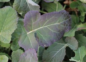 Die Verbreitung des Wasserrübenvergilbungsvirus (TuYV) beim Winterraps ist seit dem Wegfall der insektiziden Beizen deutlich gestiegen. Dieser führt zu einer violetten Verfärbung der Blätter (Bild) und kann zu Ertragsverlusten zwischen 5–15
