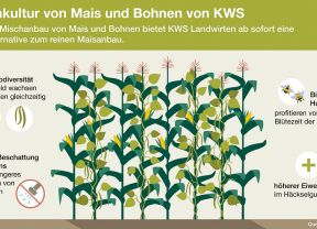 Für die kommende Saison bietet die KWS nach mehrjährigen Tests einen Pack aus Mais und Stangenbohnen an. Beide Pflanzen werden zur gleichen Zeit gesät, die Bohnen ranken am wachsenden Mais empor. Das Gemisch (acht Maispflanzen und vier