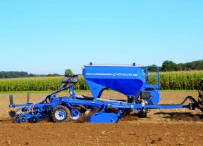 Mit der Scheibensämaschine Vitu stellte Köckerling die neue Scheibensämaschine nun auch mit 4,0 m Arbeitsbreite vor. Der Saattank hat ein Volumen von 2.700 l. Zum Einbringen des Saatgutes in den Boden wird ein Doppelscheibenschar mit einem