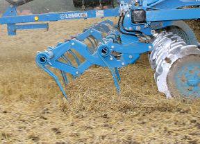 Für die aufgesattelt Kurzscheibenegge Heliodor hat Lemken einen selbstregelnden Strohstriegel vorgestellt, der vor der ersten Scheibenreihe montiert wird. Beim Ablassen des Geräts schwenkt er so weit nach vorn in Arbeitsstellung, bis ein