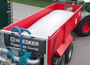 Ein vorhandener Muldenkipper kann mit dem Güllesack Flexcover Combi von Huesker innerhalb weniger als einer Stunde zu einem Gülletransportfahrzeug umgerüstet werden. Hierfür wird die werkseitige Heckklappe demontiert und das Combi-System an