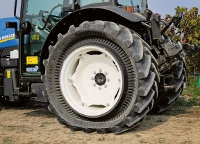 Der von Trelleborg angekündigte Spezialreifen PneuTrac soll die Vorteile landwirtschaftlichen Radialreifen mit einer traktionsstarken Lauffläche wie bei Raupenfahrzeugen verbinden. Besonderheit ist die nach innen gewölbte Seitenwand