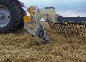 Der hydraulische Strohstriegel „Straw-Master“ von der Firma Wallner kann zur Optimierung der Strohverteilung, aber auch zur leichten Bodenbearbeitung auf dem Acker verwendet werden. Der Schwerstriegel mit 16 mm starken Zinken ist damit zur